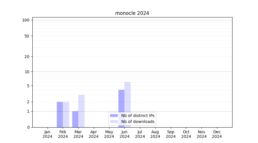 Number of downloads for experiment package monocle, year by year, from 2025 back to 2014 (years with no downloads are omitted):