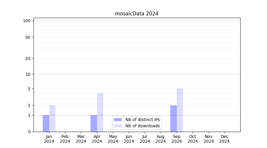 Number of downloads for experiment package mosaicData, year by year, from 2025 back to 2014 (years with no downloads are omitted):