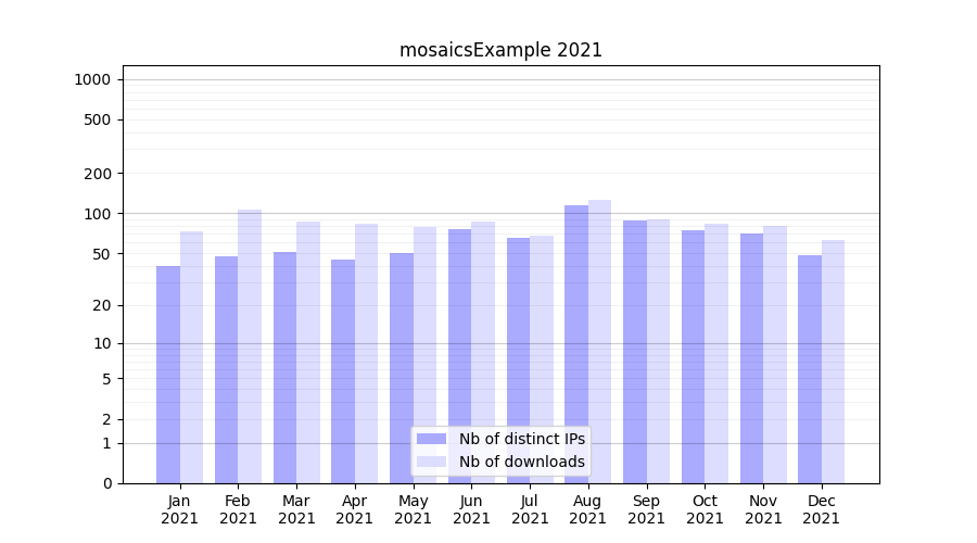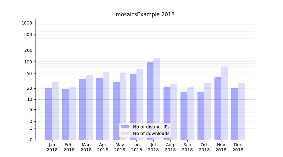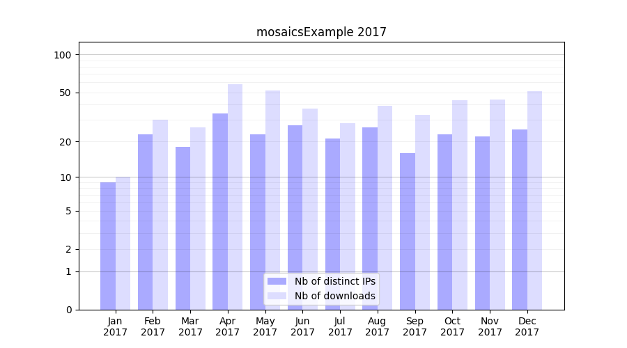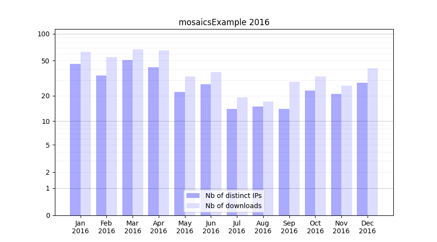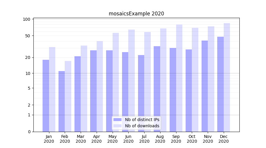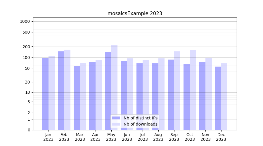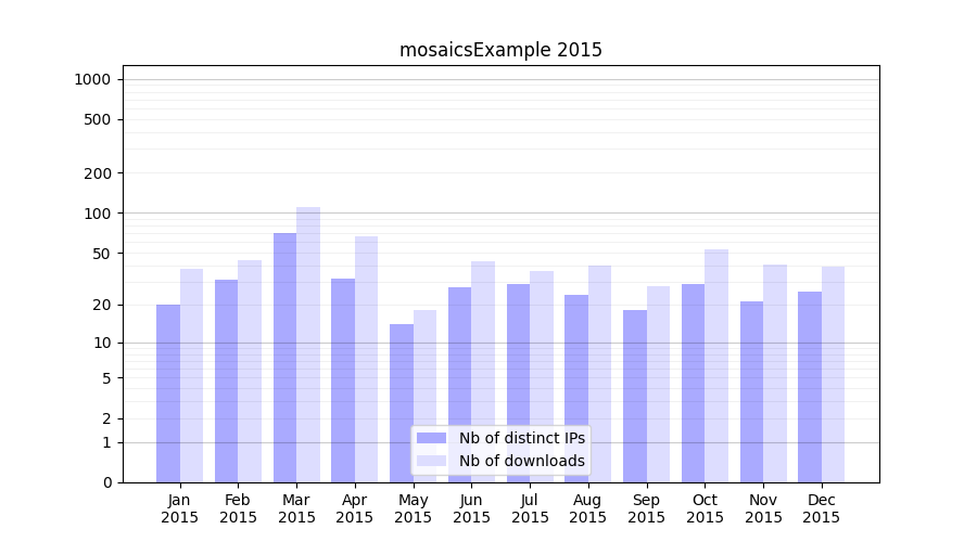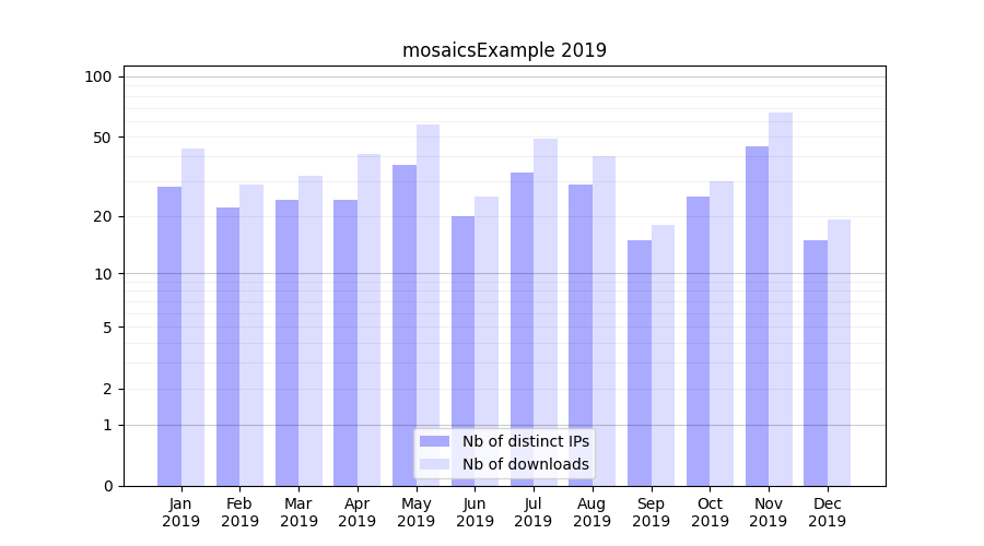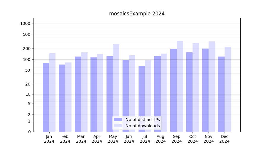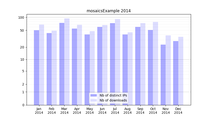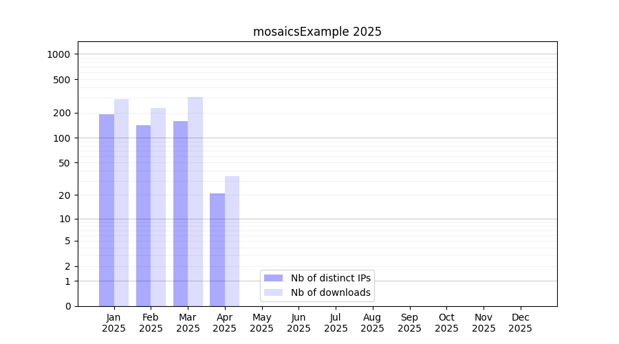 Number of downloads for experiment package mosaicsExample, year by year, from 2025 back to 2014 (years with no downloads are omitted):