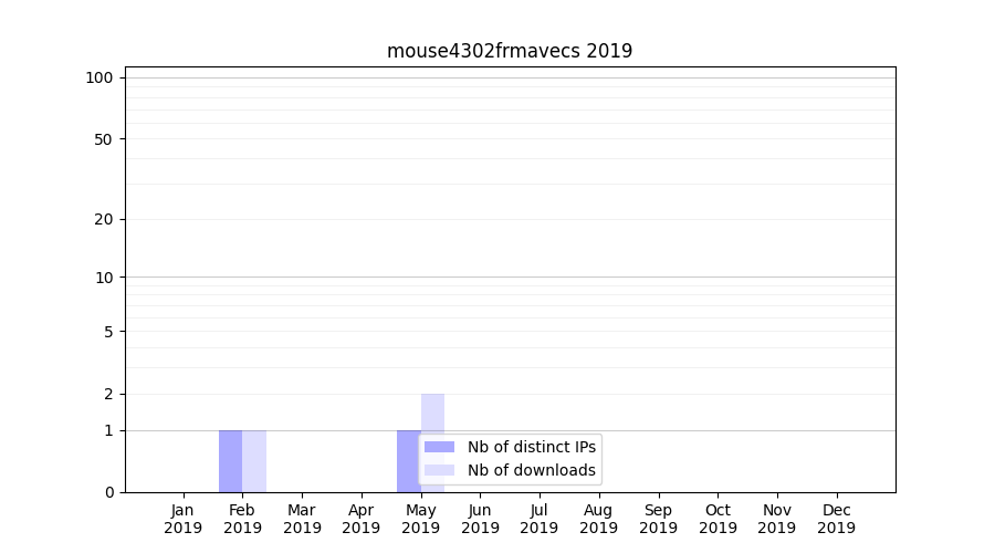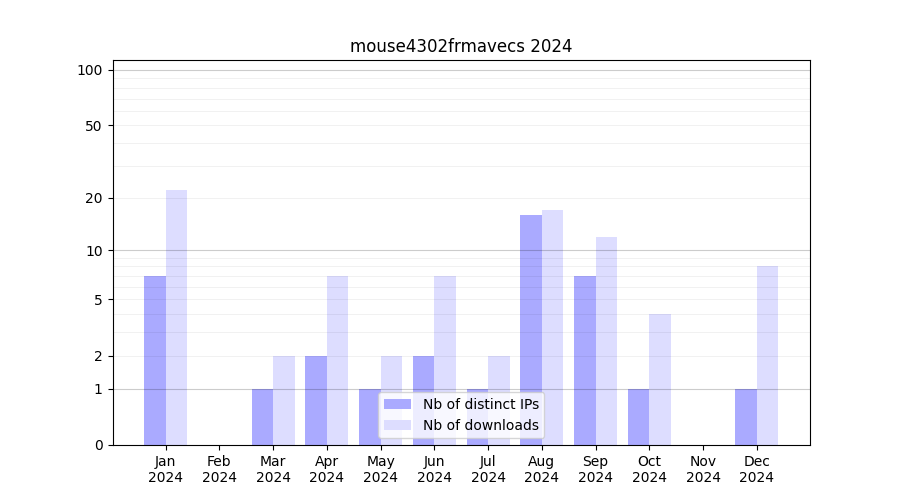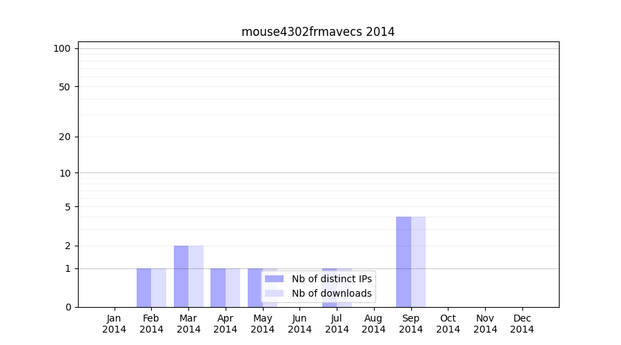Number of downloads for experiment package mouse4302frmavecs, year by year, from 2025 back to 2014 (years with no downloads are omitted):