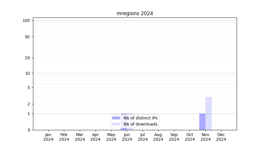 Number of downloads for experiment package mregions, year by year, from 2025 back to 2014 (years with no downloads are omitted):