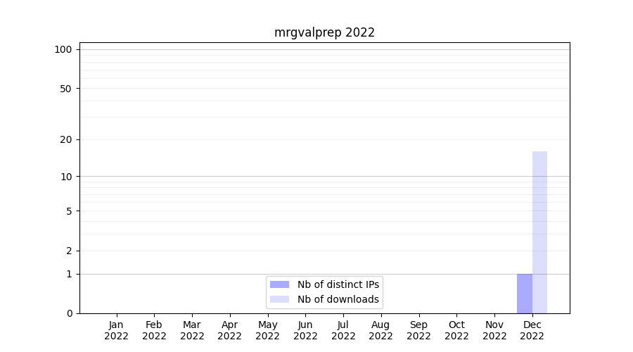 Number of downloads for experiment package mrgvalprep, year by year, from 2025 back to 2014 (years with no downloads are omitted):
