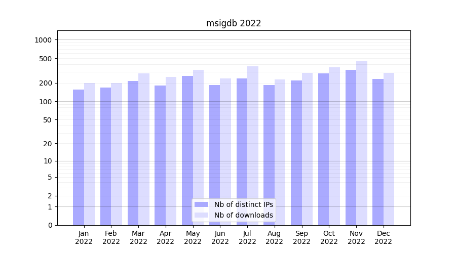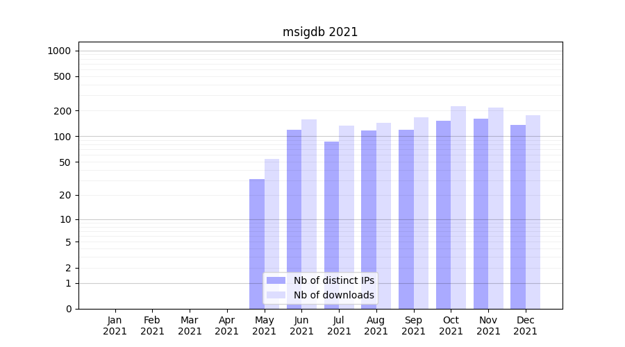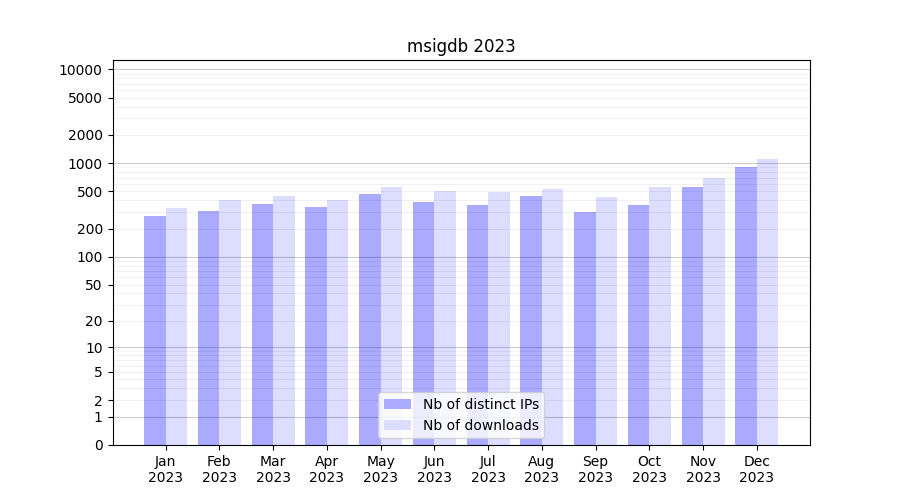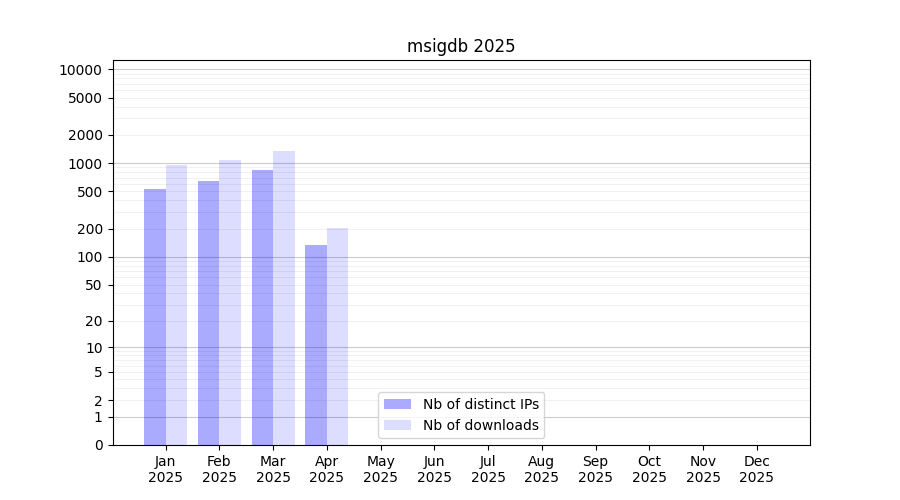Number of downloads for experiment package msigdb, year by year, from 2025 back to 2014 (years with no downloads are omitted):