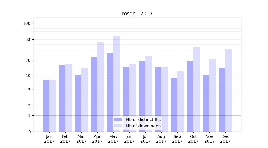 Number of downloads for experiment package msqc1, year by year, from 2025 back to 2014 (years with no downloads are omitted):