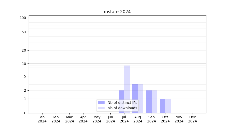 Number of downloads for experiment package mstate, year by year, from 2025 back to 2014 (years with no downloads are omitted):