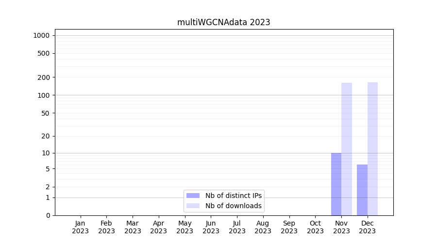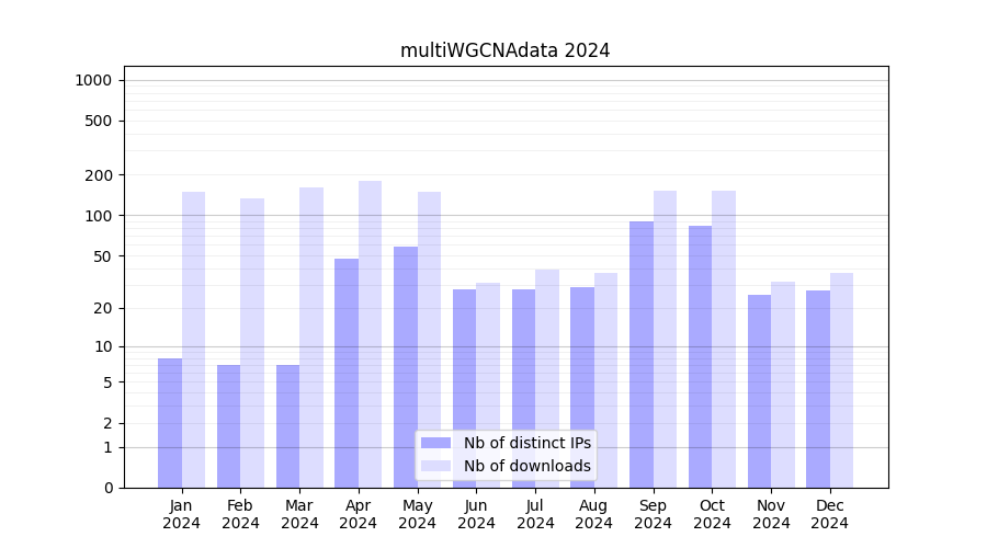 Number of downloads for experiment package multiWGCNAdata, year by year, from 2025 back to 2014 (years with no downloads are omitted):