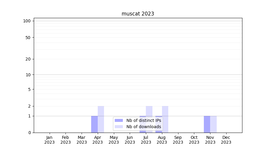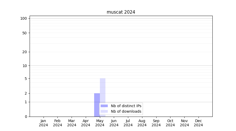 Number of downloads for experiment package muscat, year by year, from 2025 back to 2014 (years with no downloads are omitted):