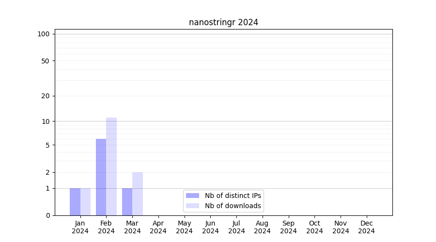 Number of downloads for experiment package nanostringr, year by year, from 2025 back to 2014 (years with no downloads are omitted):