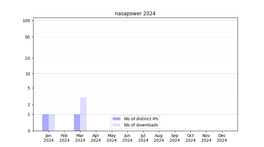 Number of downloads for experiment package nasapower, year by year, from 2025 back to 2014 (years with no downloads are omitted):