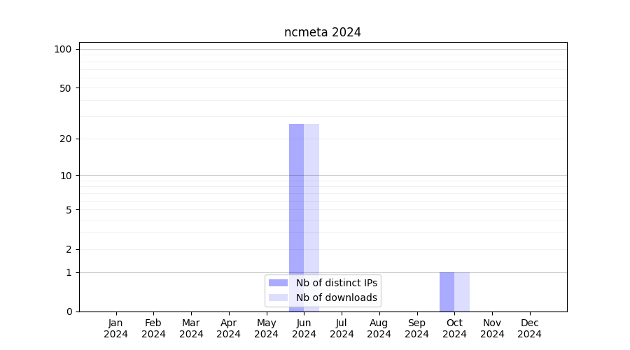 Number of downloads for experiment package ncmeta, year by year, from 2025 back to 2014 (years with no downloads are omitted):