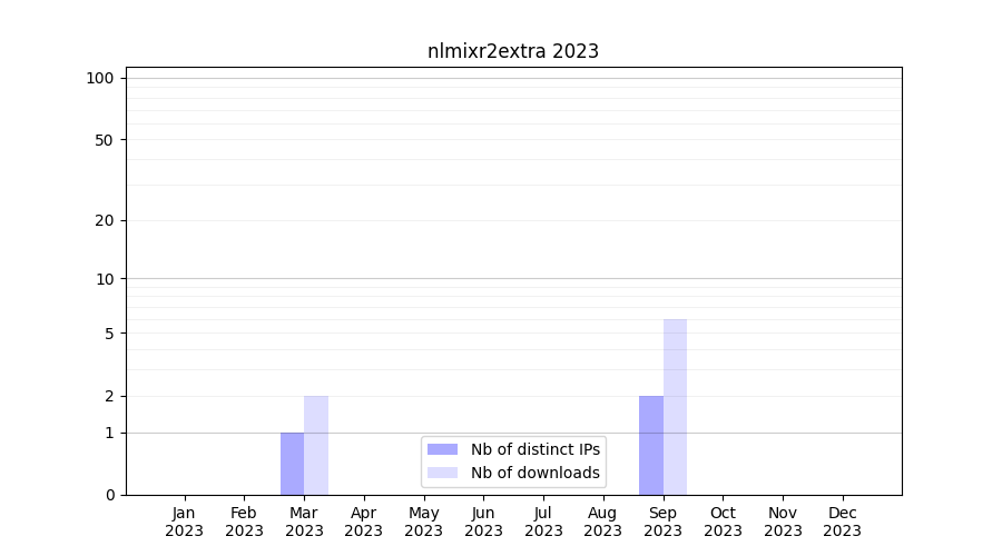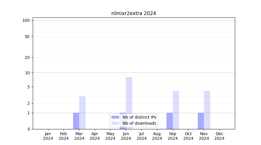 Number of downloads for experiment package nlmixr2extra, year by year, from 2025 back to 2014 (years with no downloads are omitted):