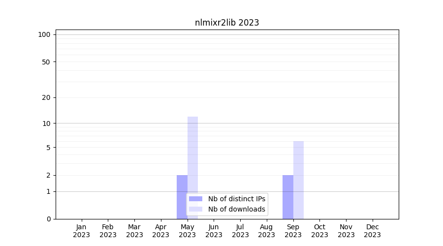 Number of downloads for experiment package nlmixr2lib, year by year, from 2025 back to 2014 (years with no downloads are omitted):