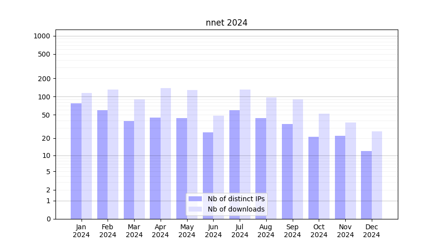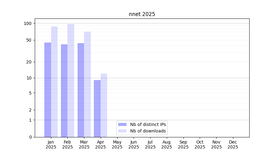 Number of downloads for experiment package nnet, year by year, from 2025 back to 2014 (years with no downloads are omitted):