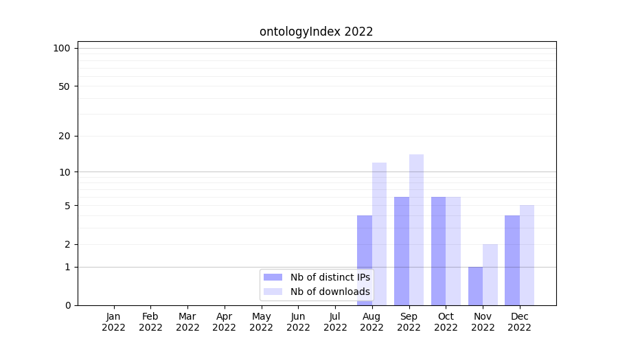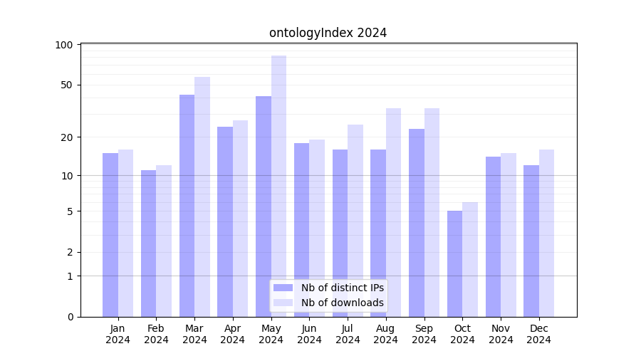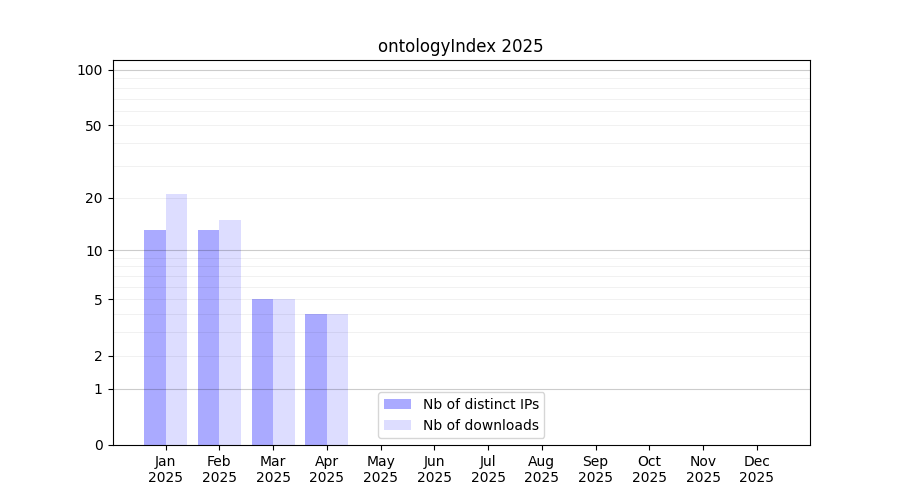 Number of downloads for experiment package ontologyIndex, year by year, from 2025 back to 2014 (years with no downloads are omitted):