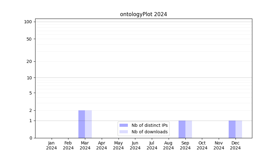 Number of downloads for experiment package ontologyPlot, year by year, from 2025 back to 2014 (years with no downloads are omitted):