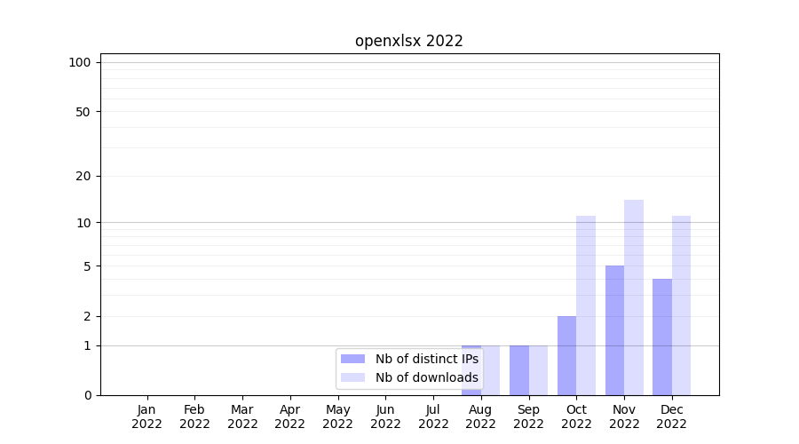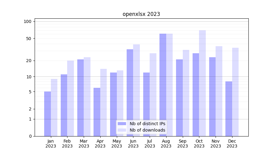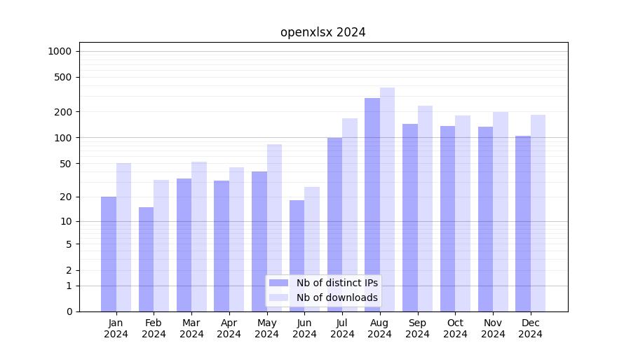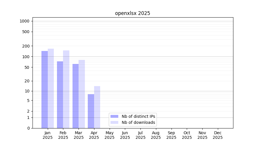 Number of downloads for experiment package openxlsx, year by year, from 2025 back to 2014 (years with no downloads are omitted):