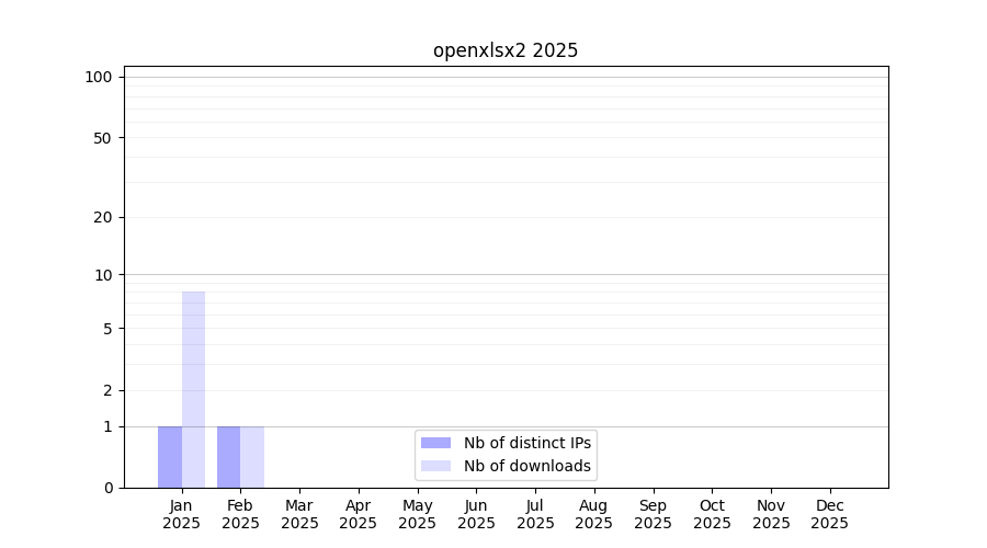 Number of downloads for experiment package openxlsx2, year by year, from 2025 back to 2014 (years with no downloads are omitted):