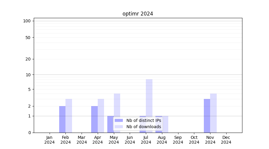 Number of downloads for experiment package optimr, year by year, from 2025 back to 2014 (years with no downloads are omitted):