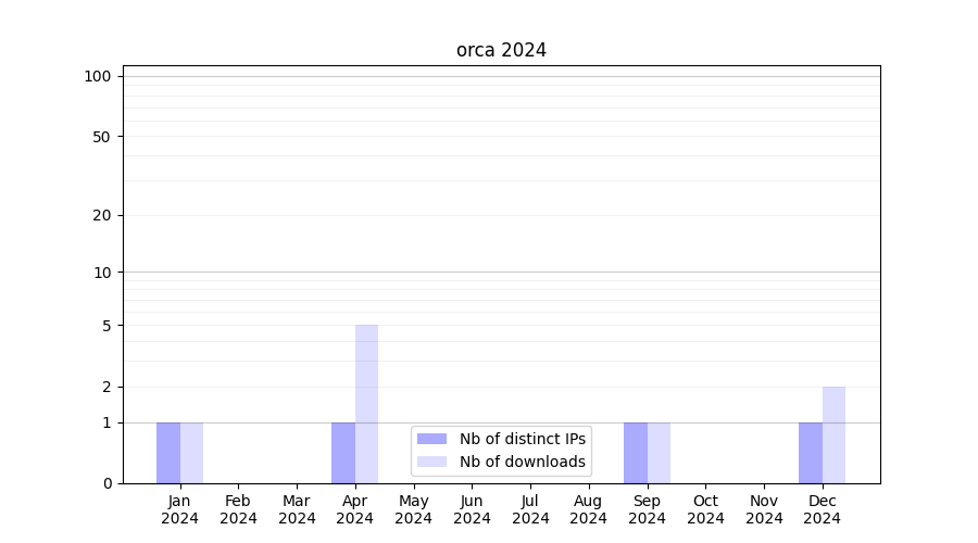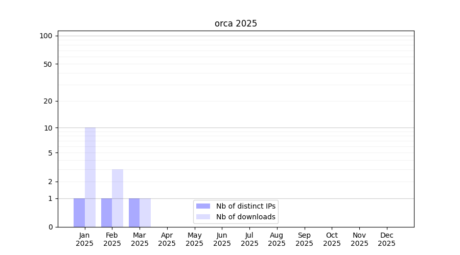 Number of downloads for experiment package orca, year by year, from 2025 back to 2014 (years with no downloads are omitted):