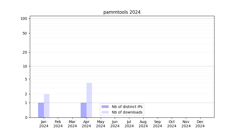 Number of downloads for experiment package pammtools, year by year, from 2025 back to 2014 (years with no downloads are omitted):
