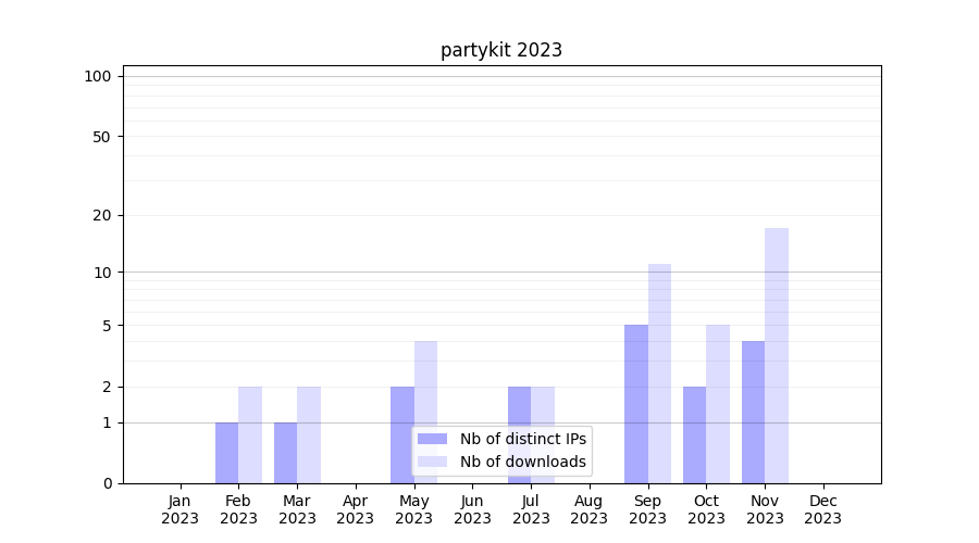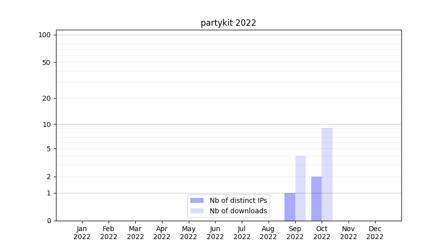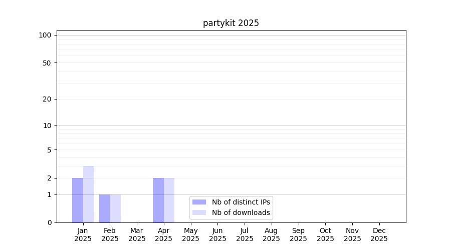 Number of downloads for experiment package partykit, year by year, from 2025 back to 2014 (years with no downloads are omitted):