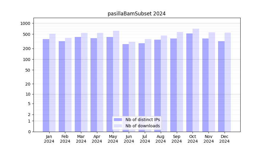 Number of downloads for experiment package pasillaBamSubset, year by year, from 2025 back to 2014 (years with no downloads are omitted):