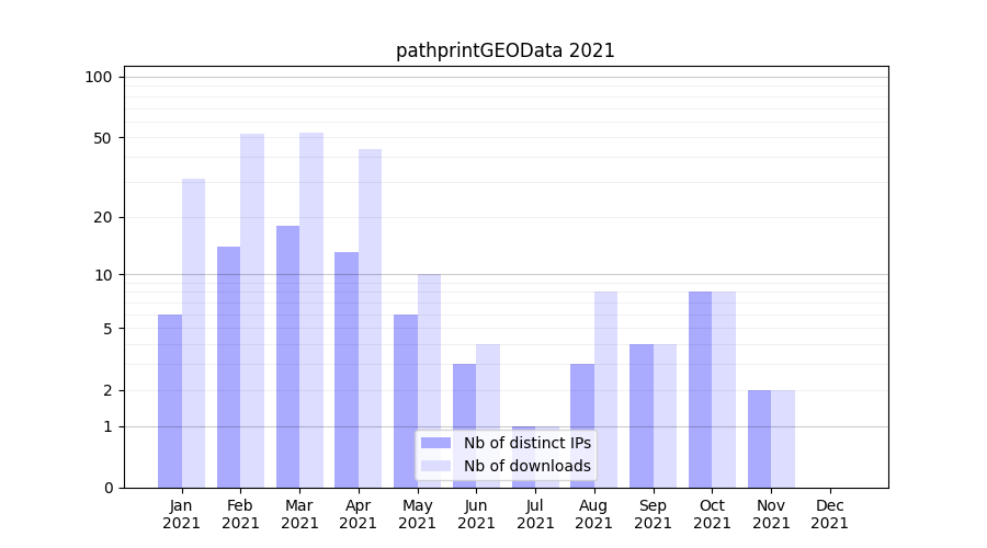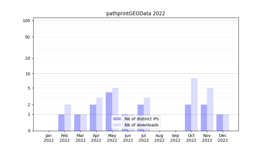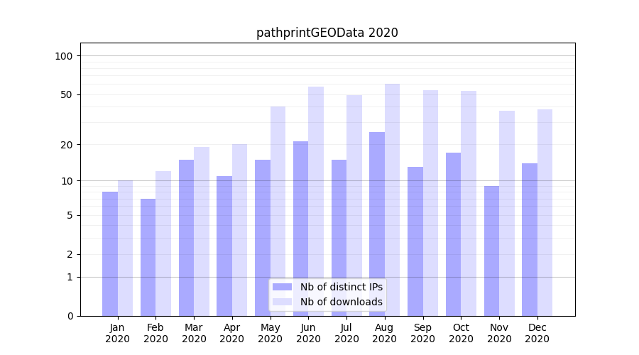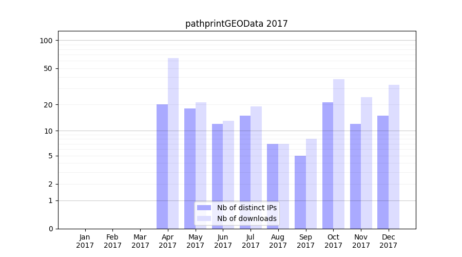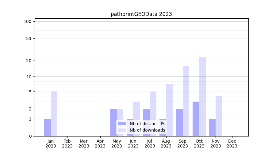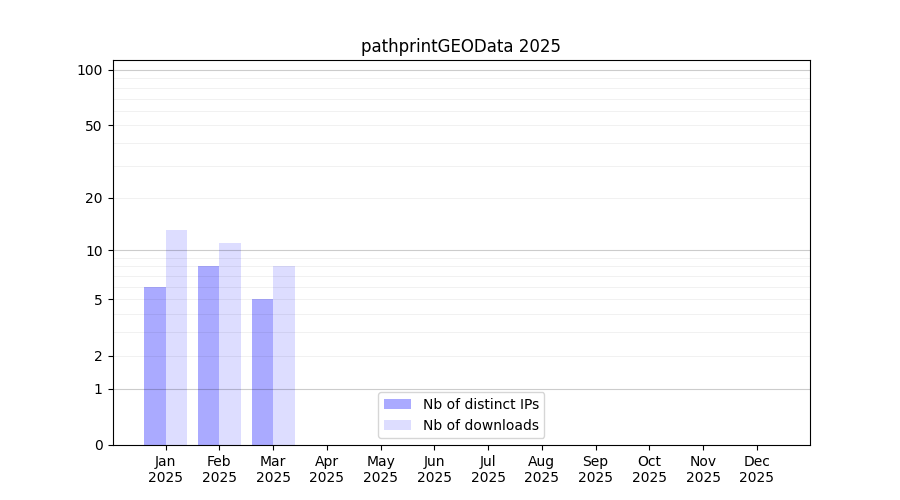 Number of downloads for experiment package pathprintGEOData, year by year, from 2025 back to 2014 (years with no downloads are omitted):