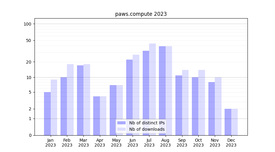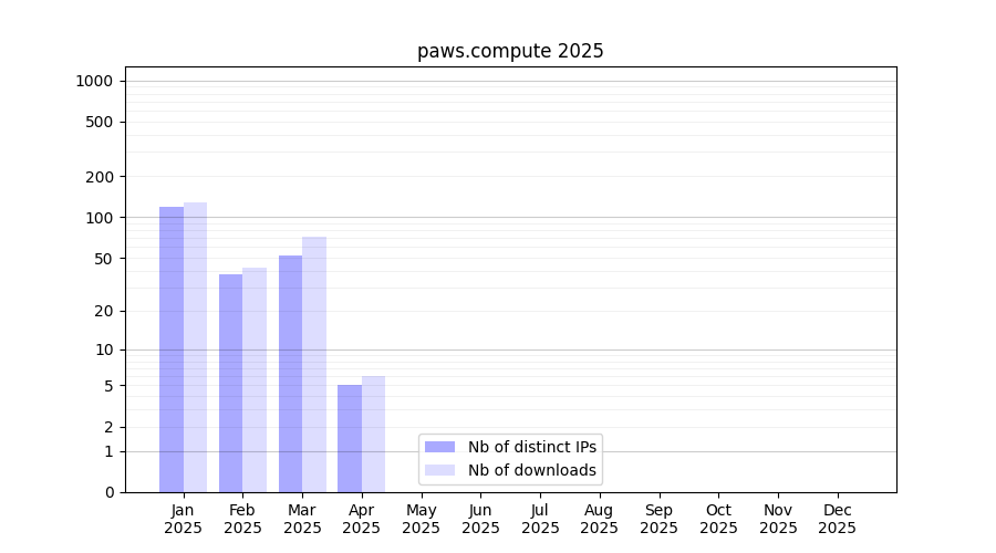 Number of downloads for experiment package paws.compute, year by year, from 2025 back to 2014 (years with no downloads are omitted):