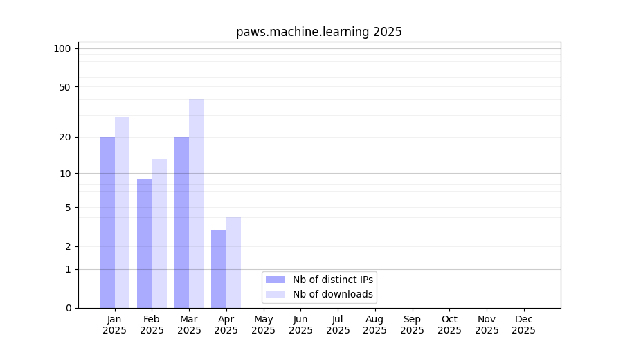 Number of downloads for experiment package paws.machine.learning, year by year, from 2025 back to 2014 (years with no downloads are omitted):