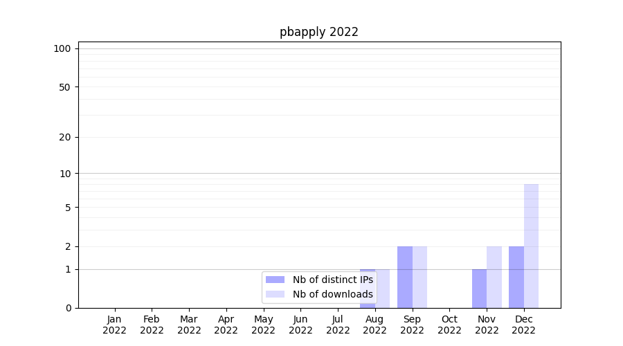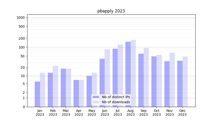 Number of downloads for experiment package pbapply, year by year, from 2025 back to 2014 (years with no downloads are omitted):