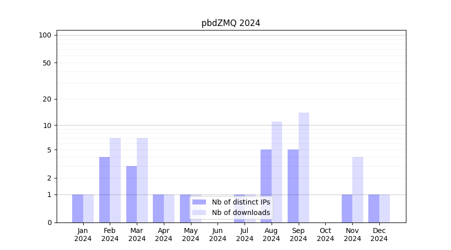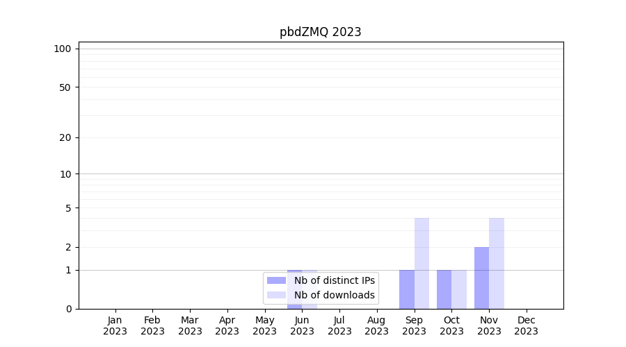 Number of downloads for experiment package pbdZMQ, year by year, from 2025 back to 2014 (years with no downloads are omitted):