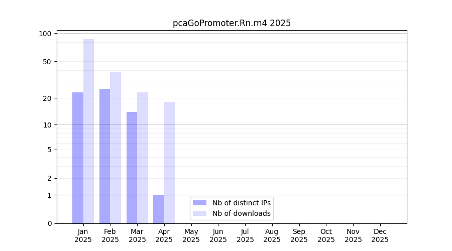 Number of downloads for experiment package pcaGoPromoter.Rn.rn4, year by year, from 2025 back to 2014 (years with no downloads are omitted):
