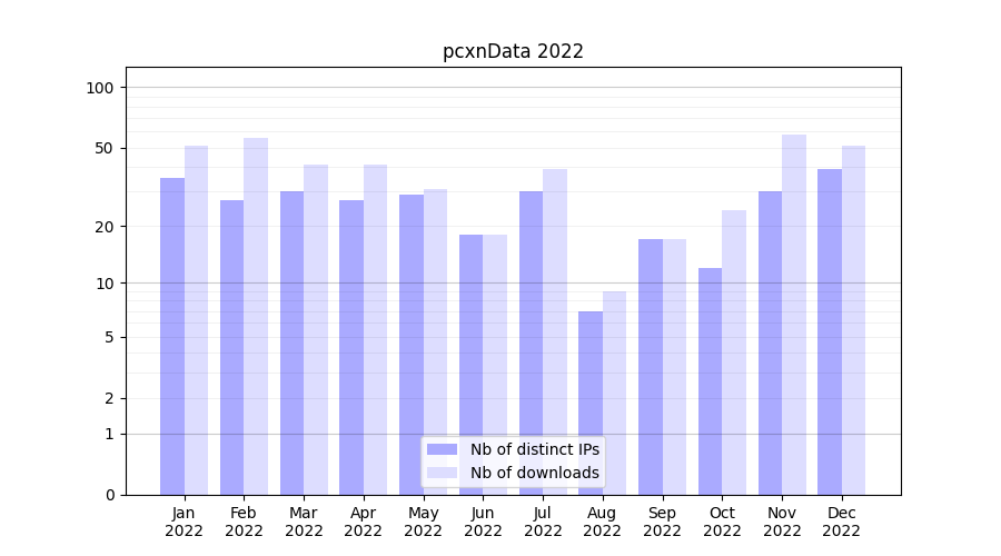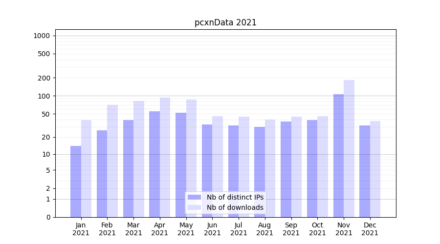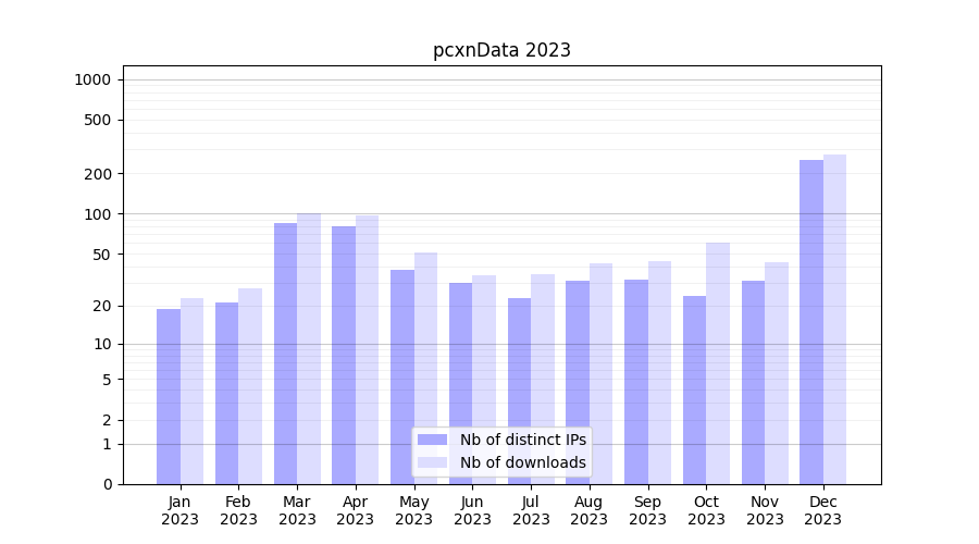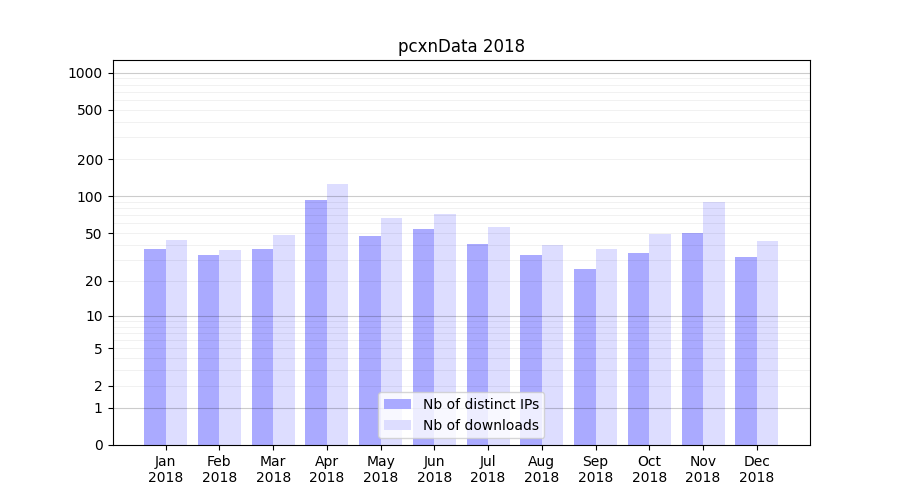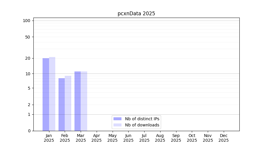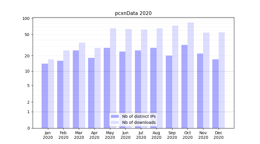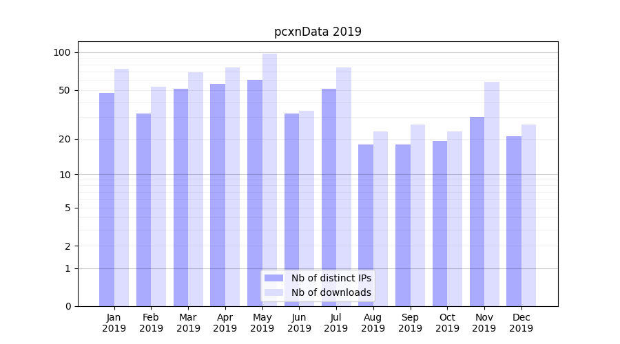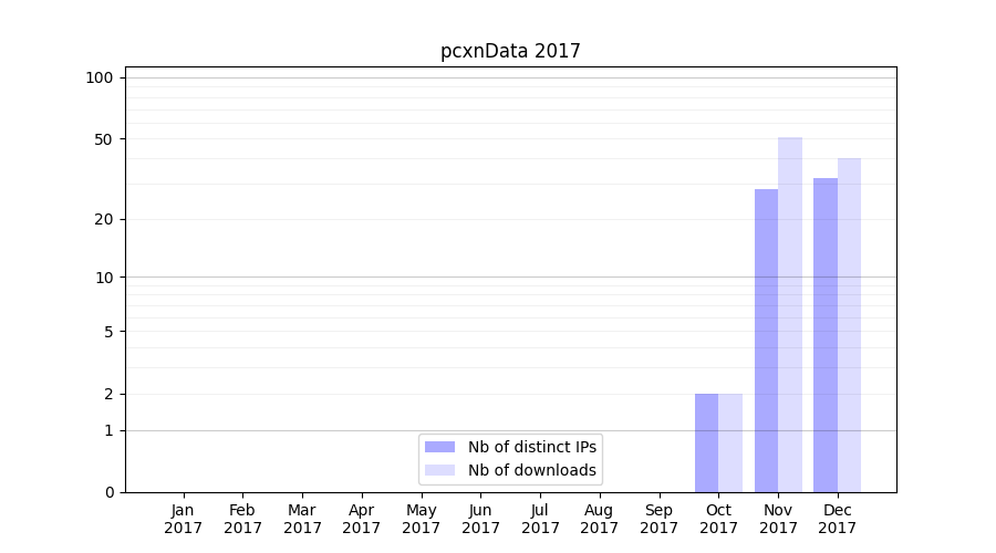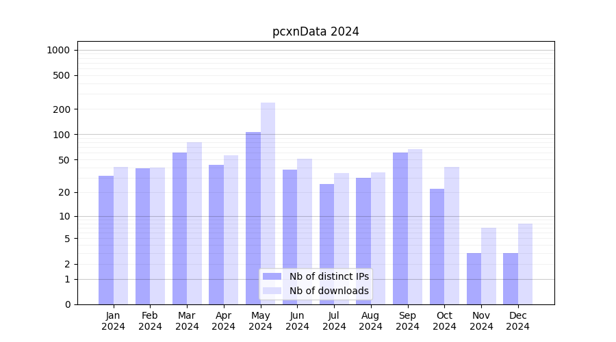 Number of downloads for experiment package pcxnData, year by year, from 2025 back to 2014 (years with no downloads are omitted):