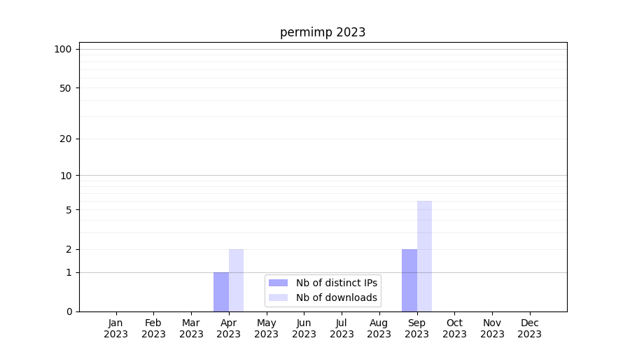 Number of downloads for experiment package permimp, year by year, from 2025 back to 2014 (years with no downloads are omitted):