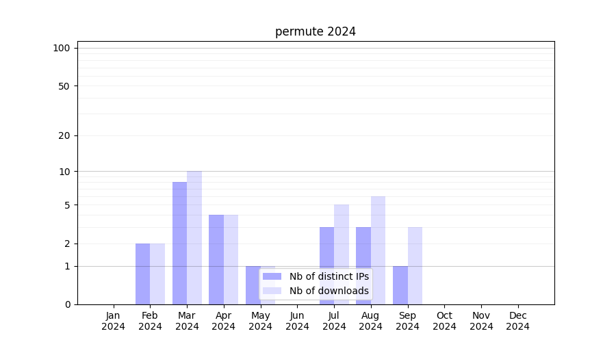 Number of downloads for experiment package permute, year by year, from 2025 back to 2014 (years with no downloads are omitted):
