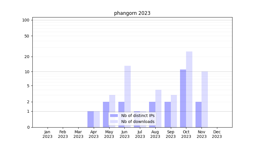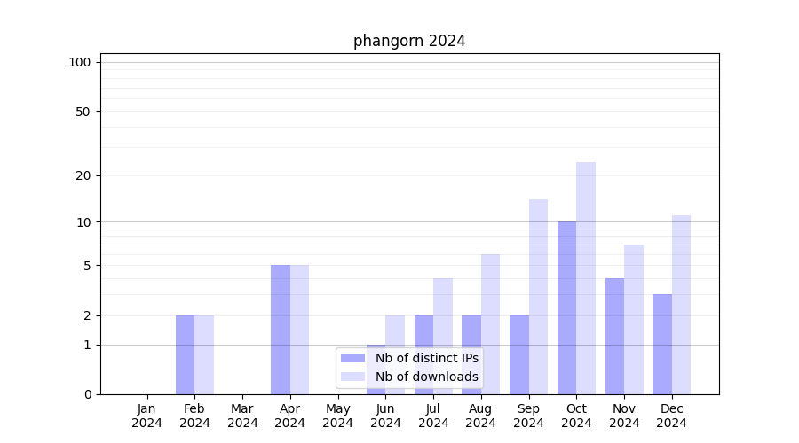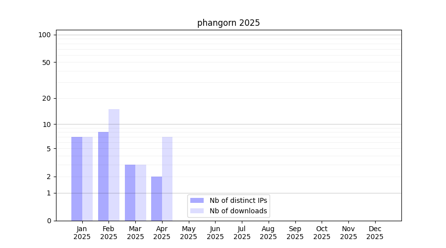 Number of downloads for experiment package phangorn, year by year, from 2025 back to 2014 (years with no downloads are omitted):