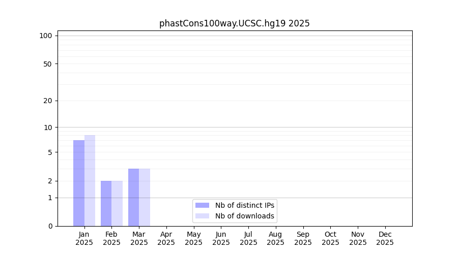 Number of downloads for experiment package phastCons100way.UCSC.hg19, year by year, from 2025 back to 2014 (years with no downloads are omitted):