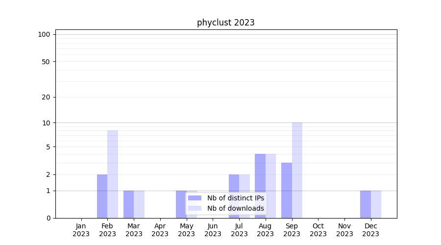 Number of downloads for experiment package phyclust, year by year, from 2025 back to 2014 (years with no downloads are omitted):