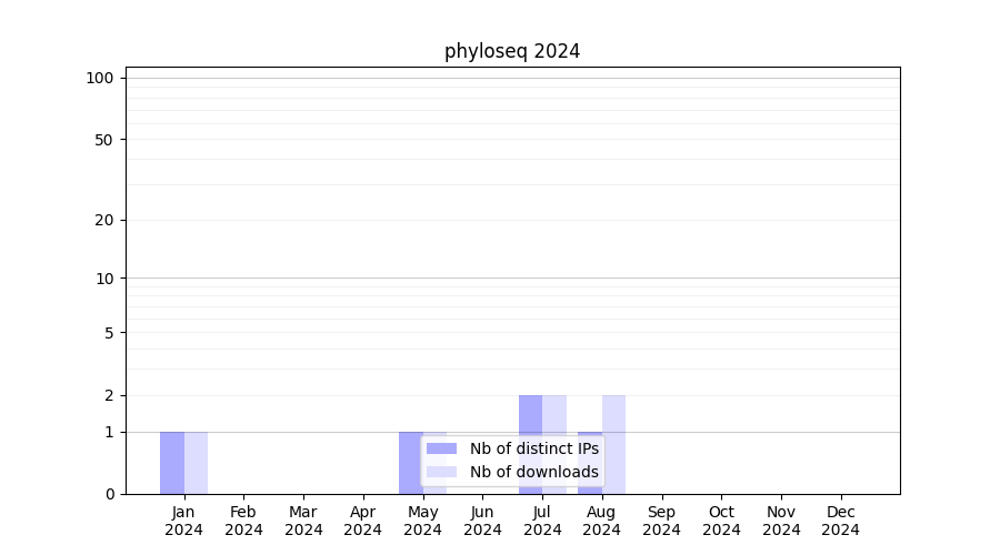 Number of downloads for experiment package phyloseq, year by year, from 2025 back to 2014 (years with no downloads are omitted):