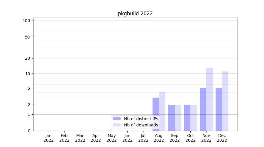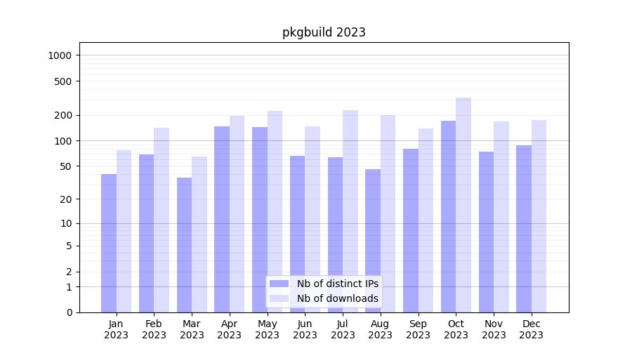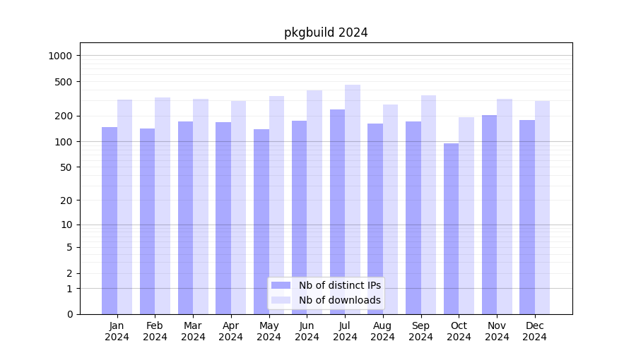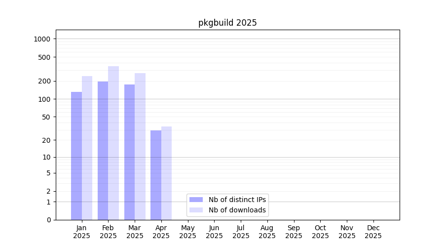 Number of downloads for experiment package pkgbuild, year by year, from 2025 back to 2014 (years with no downloads are omitted):