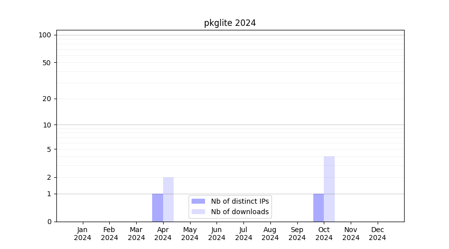 Number of downloads for experiment package pkglite, year by year, from 2025 back to 2014 (years with no downloads are omitted):