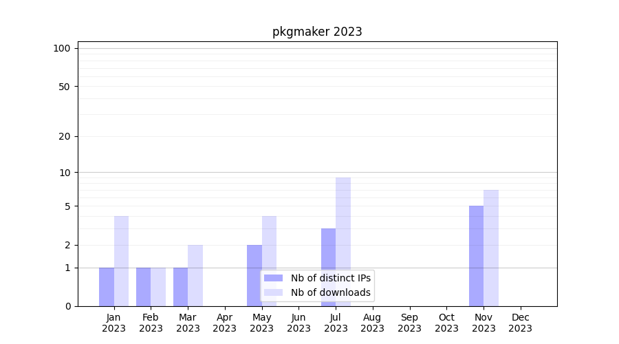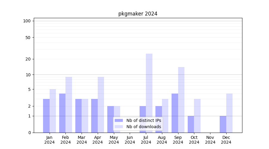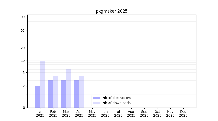 Number of downloads for experiment package pkgmaker, year by year, from 2025 back to 2014 (years with no downloads are omitted):
