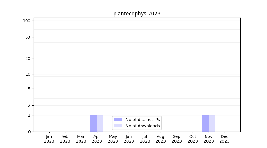 Number of downloads for experiment package plantecophys, year by year, from 2025 back to 2014 (years with no downloads are omitted):