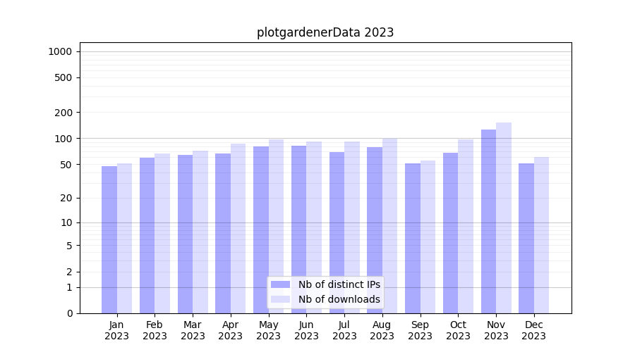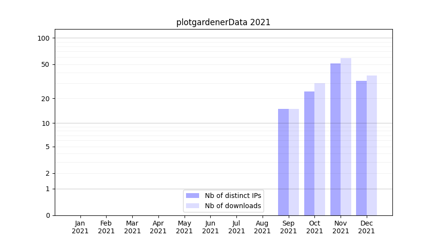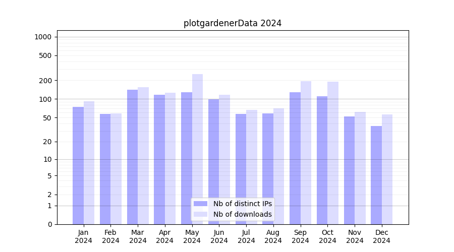 Number of downloads for experiment package plotgardenerData, year by year, from 2025 back to 2014 (years with no downloads are omitted):