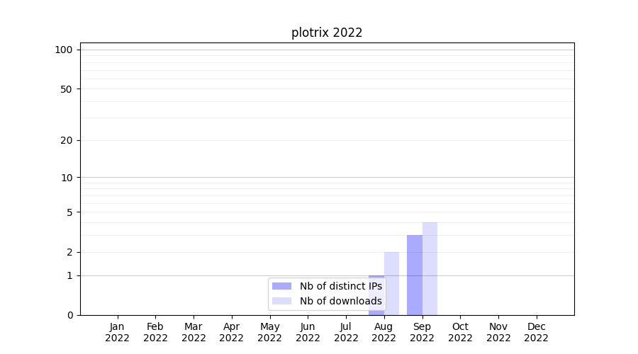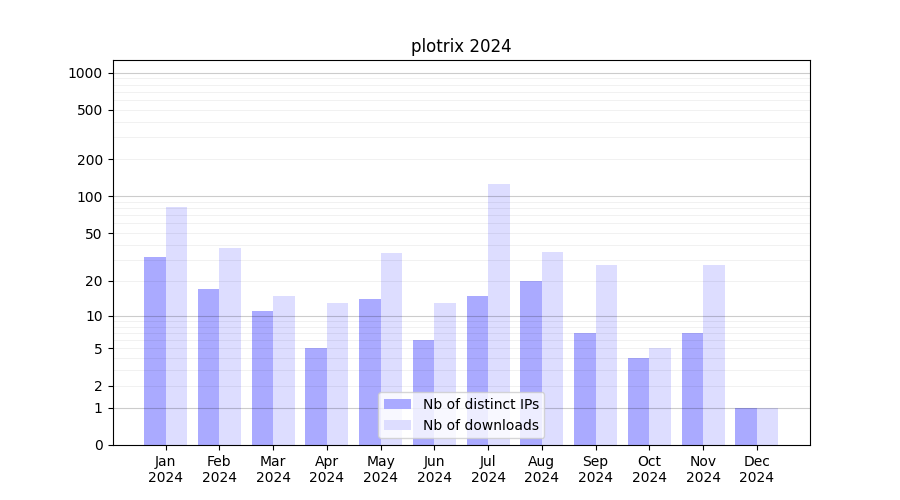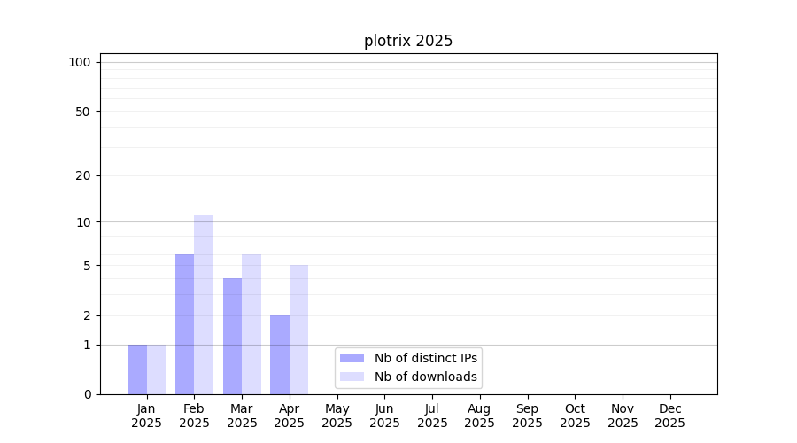 Number of downloads for experiment package plotrix, year by year, from 2025 back to 2014 (years with no downloads are omitted):