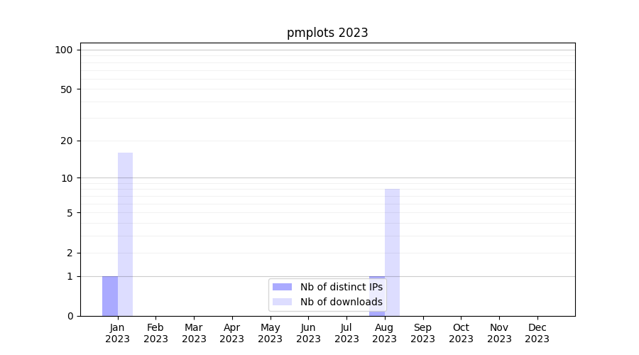 Number of downloads for experiment package pmplots, year by year, from 2025 back to 2014 (years with no downloads are omitted):