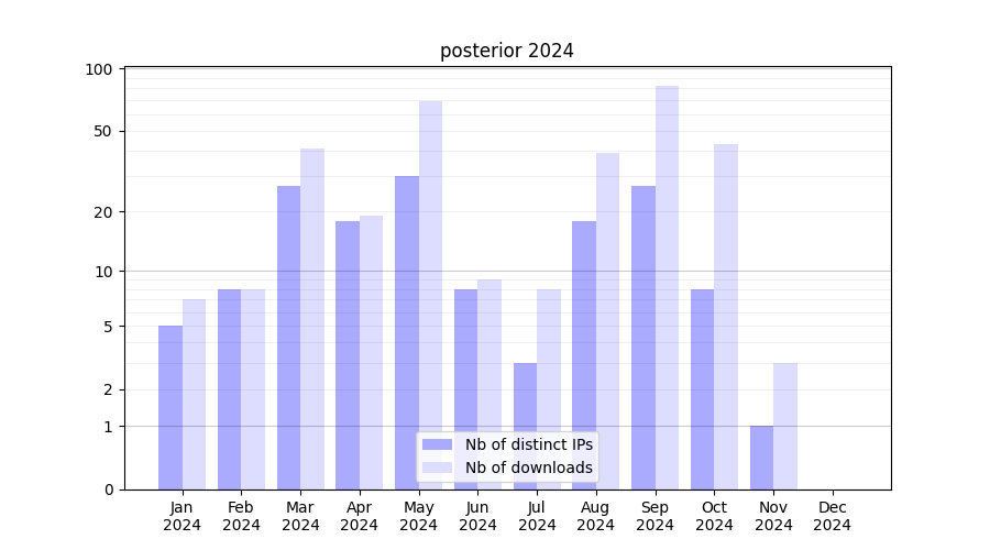 Number of downloads for experiment package posterior, year by year, from 2025 back to 2014 (years with no downloads are omitted):