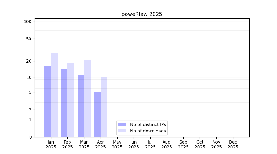 Number of downloads for experiment package poweRlaw, year by year, from 2025 back to 2014 (years with no downloads are omitted):