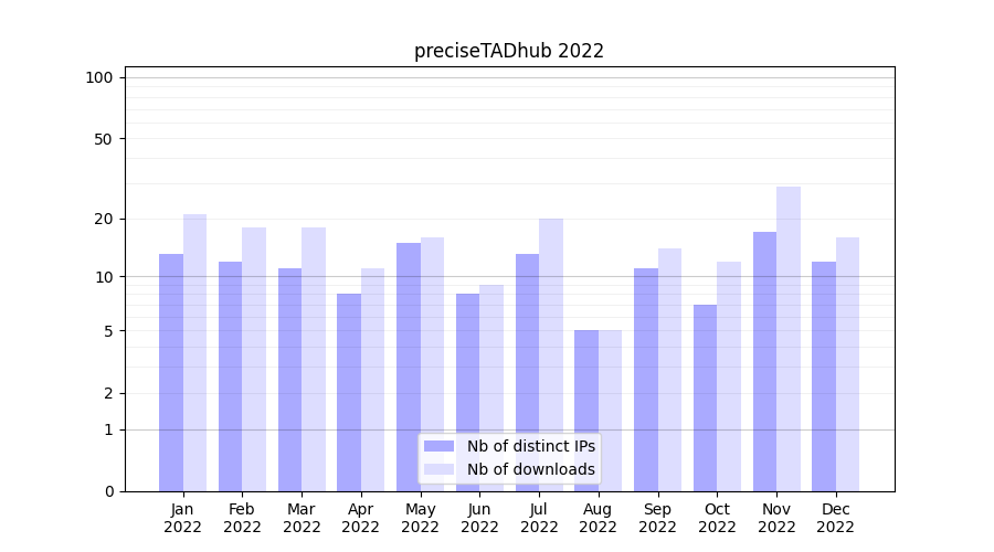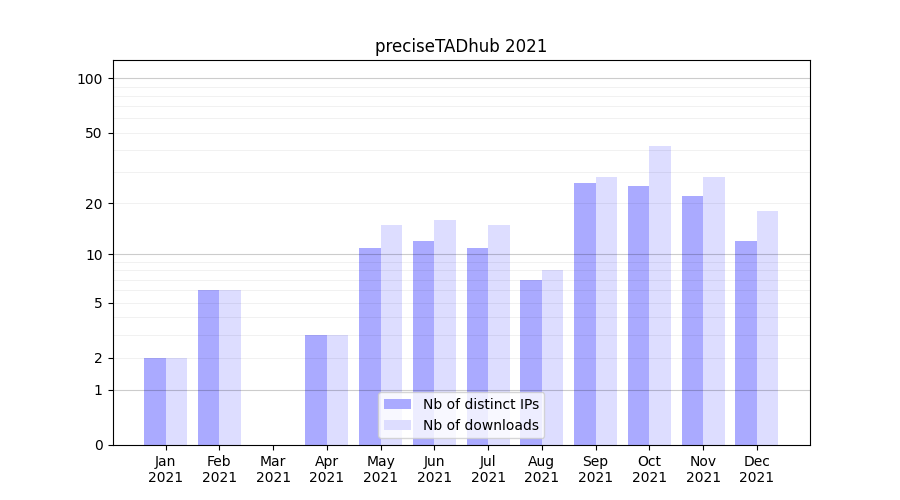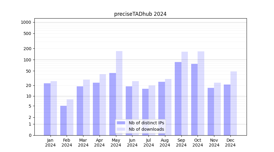 Number of downloads for experiment package preciseTADhub, year by year, from 2025 back to 2014 (years with no downloads are omitted):