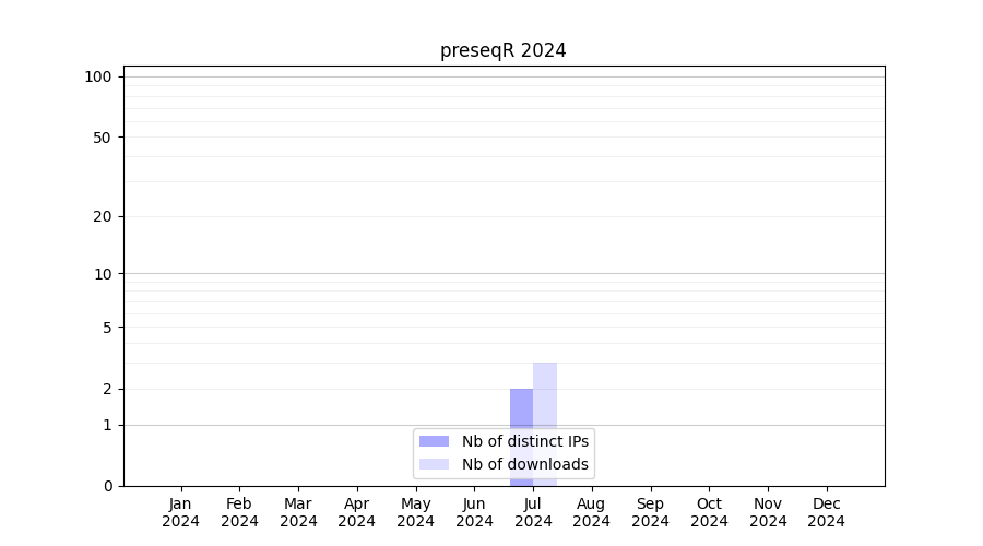 Number of downloads for experiment package preseqR, year by year, from 2025 back to 2014 (years with no downloads are omitted):